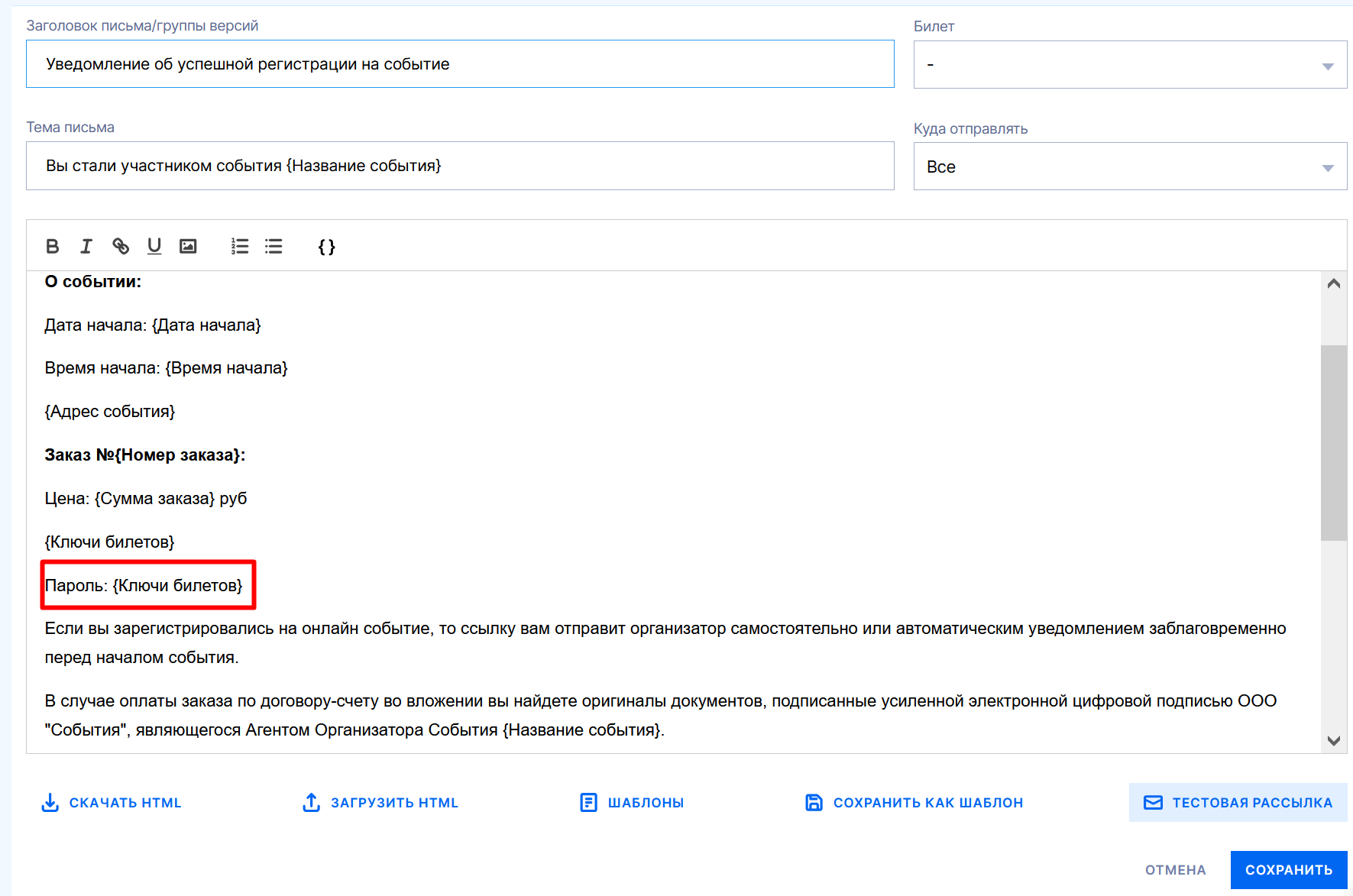 Обратите внимание! Перед отправкой ключей рекомендуем проверить уведомления на наличие переменной {Ключи билетов}.