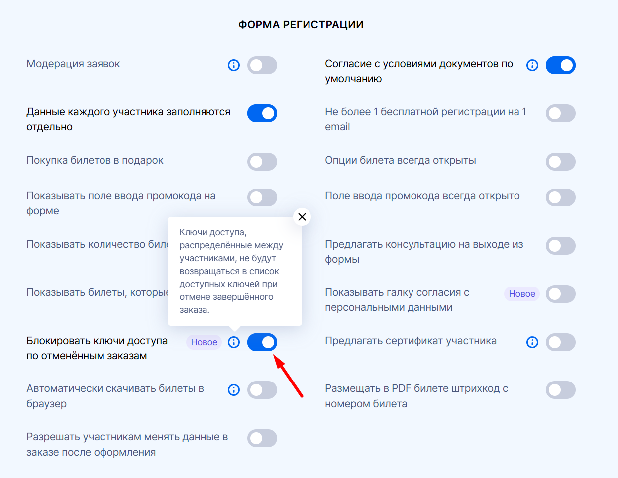 Также вы можете зашить индивидуальный ключ в QR-код, который отображается в билете. Для этого оплатите услугу скрытия копирайта. После перейдите в настройки события, раздел Регистрация и билеты и установите переключатель Содержимое QR-кода на пункт Персональный ключ доступа.