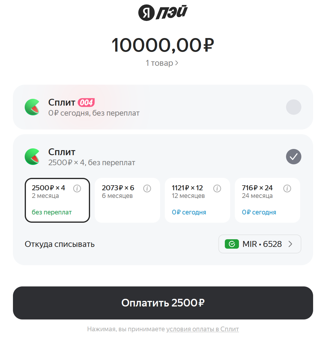 Оформить Сплит для покупки билета можно на 2, 4 или 6, 12 и 24 месяцев. Если участник выбирает оплату от двух месяцев, Яндекс начисляет комиссию сервиса — она уже включена в платеж.