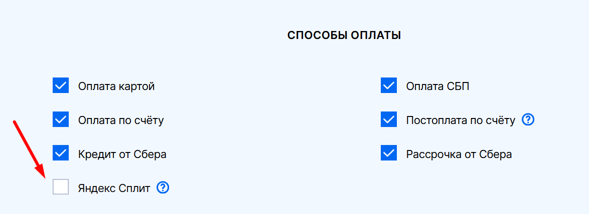 По умолчанию способ отключен. Чтобы его подключить, перейдите в настройки события в раздел “Регистрация и билеты” и поставьте галочку напротив способа “Яндекс Сплит”.